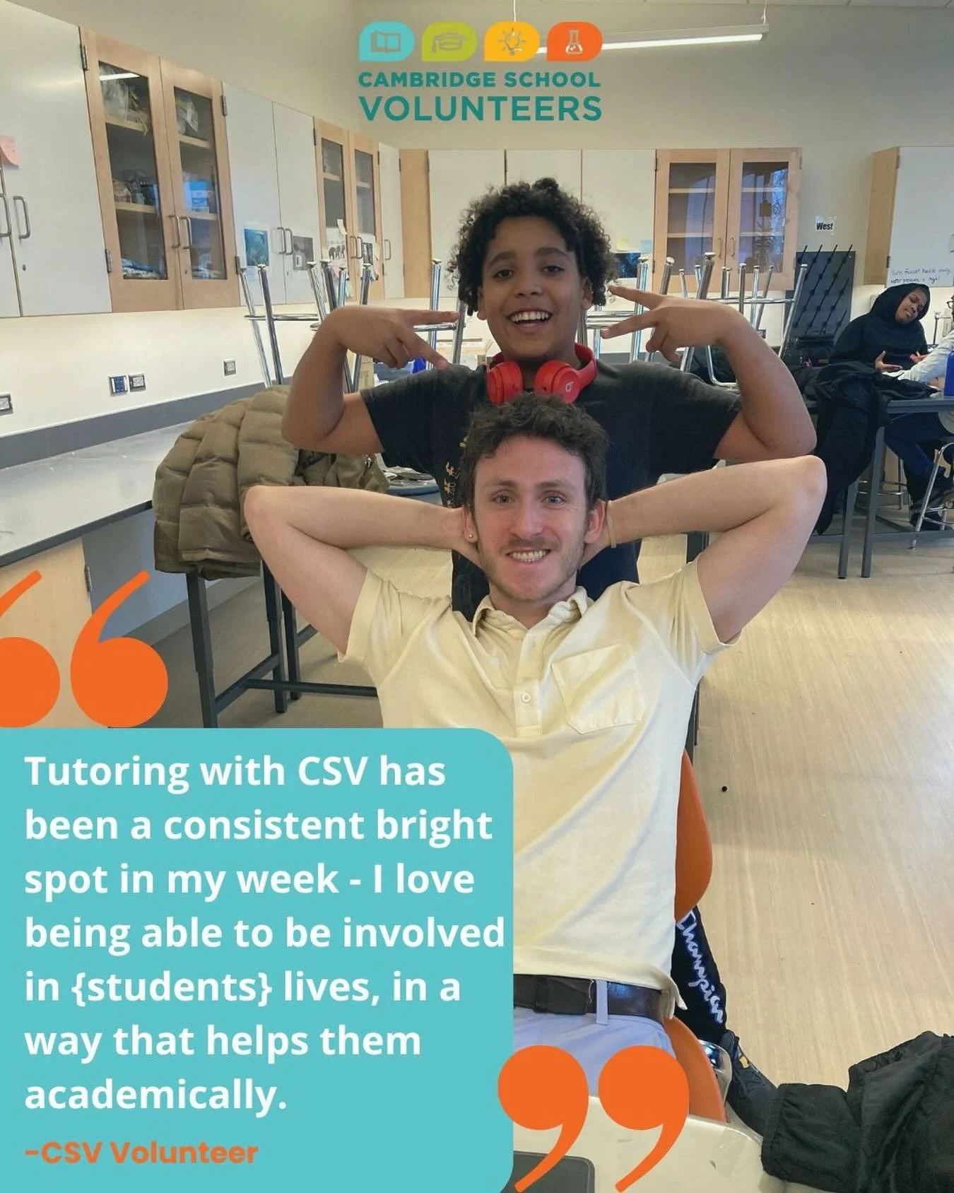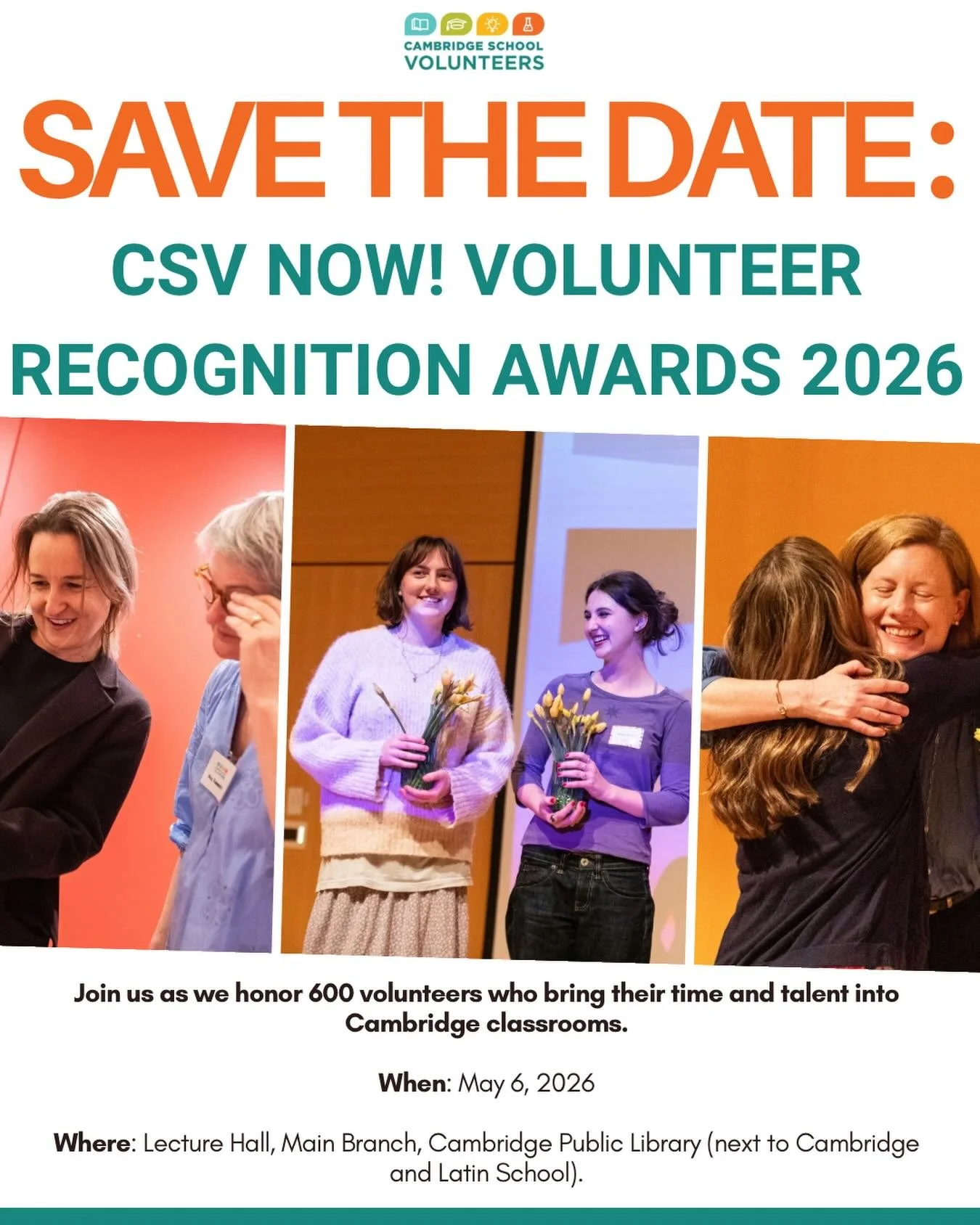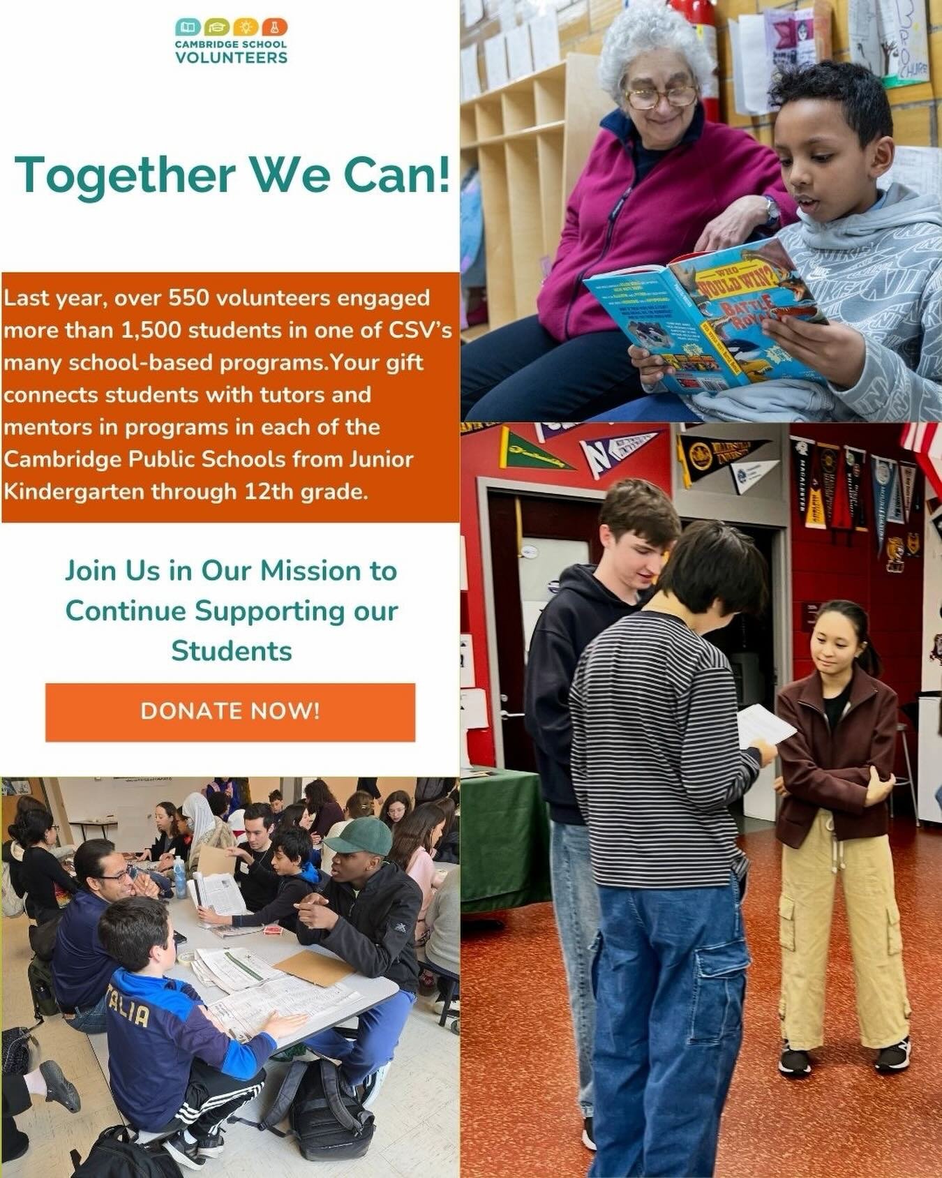 Cambridge School Volunteers (CSV), an independent non-profit founded in 1966, helps support the academic and personal success of Cambridge public school students. CSV develops programs that match caring and competent volunteers with students of all needs and levels.