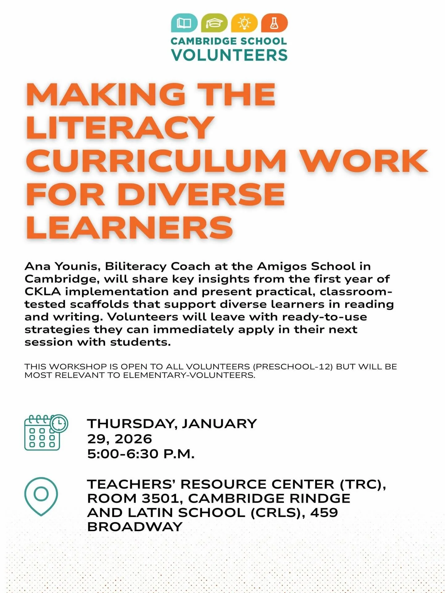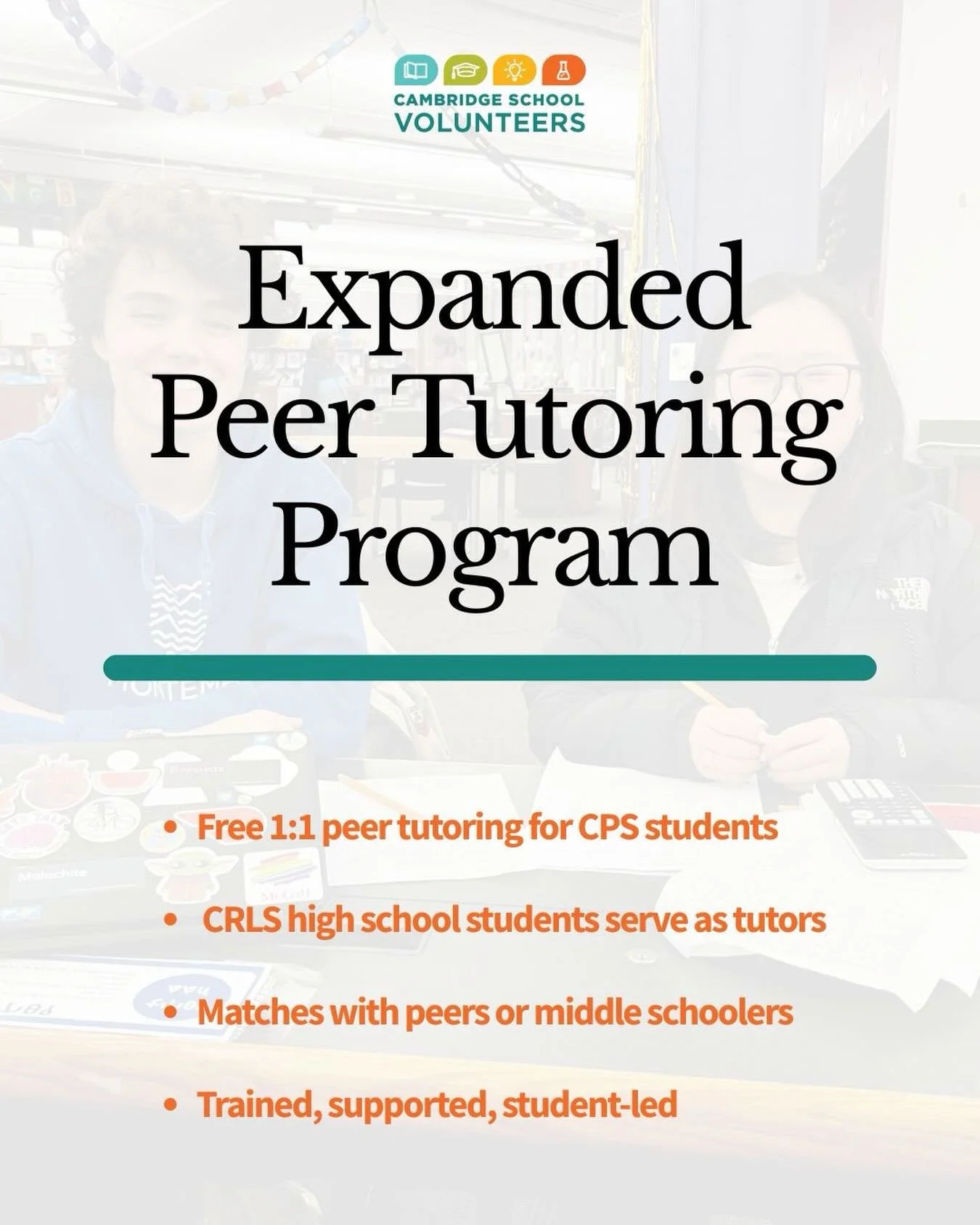 Cambridge School Volunteers (CSV) is a nonprofit organization that works with Cambridge Public School teachers, math and English Language Arts (ELA) coaches, guidance counselors, and other CPS staff to place trained volunteers in schools and classrooms—before, during, and after school—where they are most needed to support student success. All services are free for students.